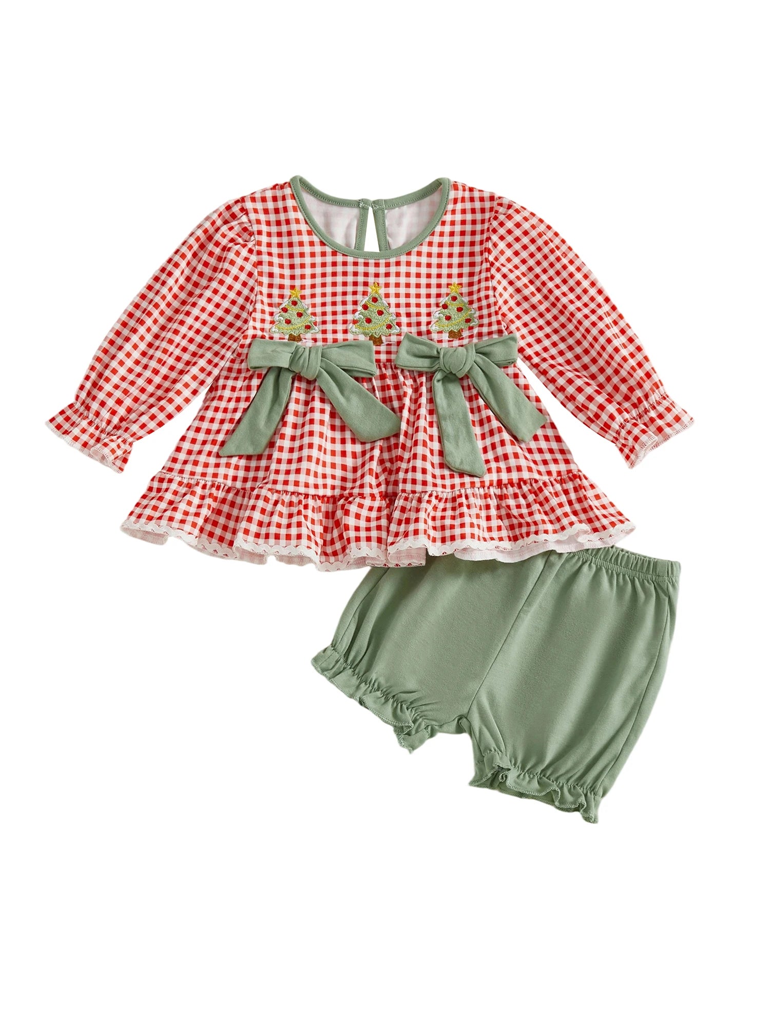 2Pcs Baby Girl Christmas Outfits Long Sleeve Plaid Print Tops + Shorts Set Newborn Clothes