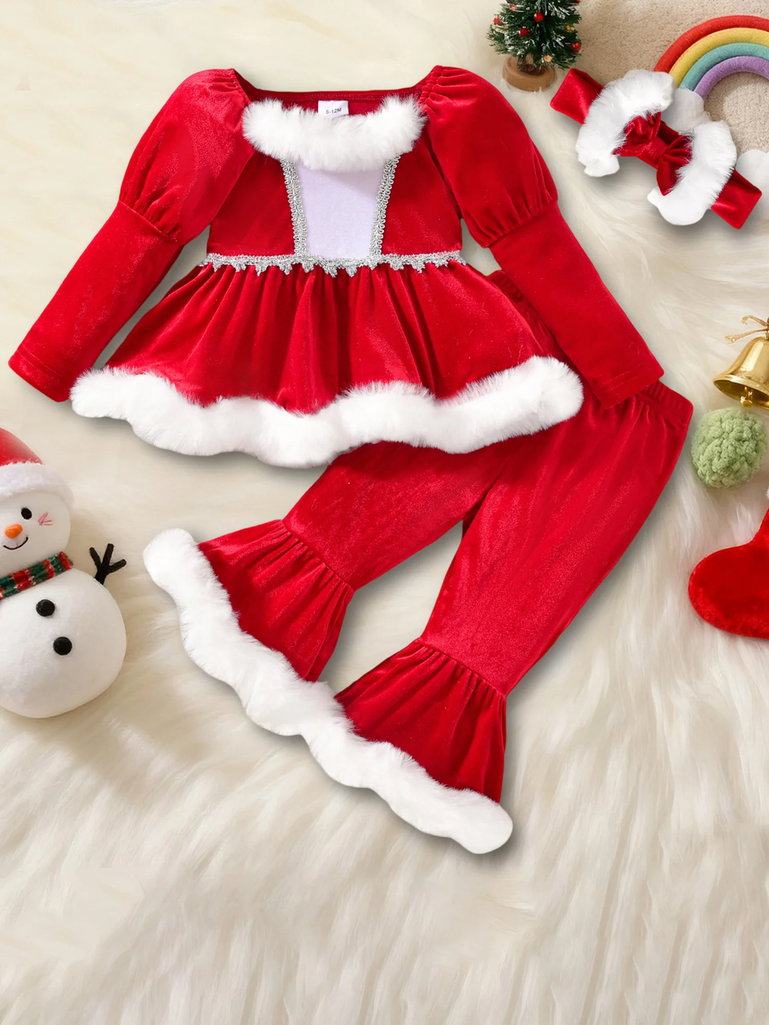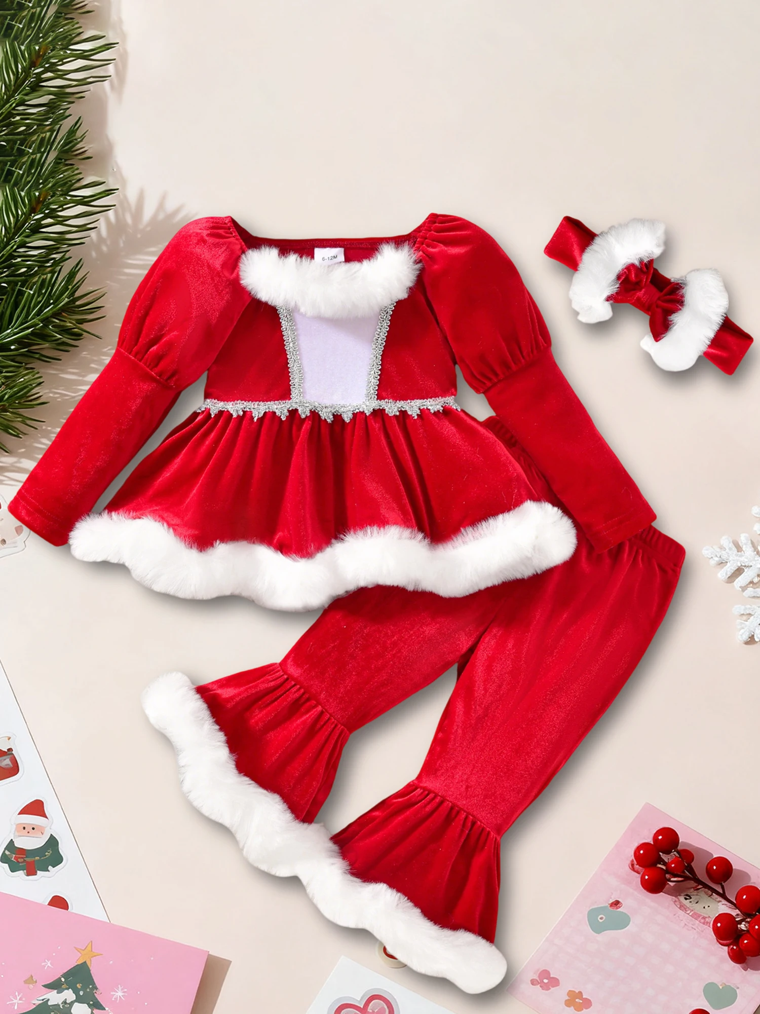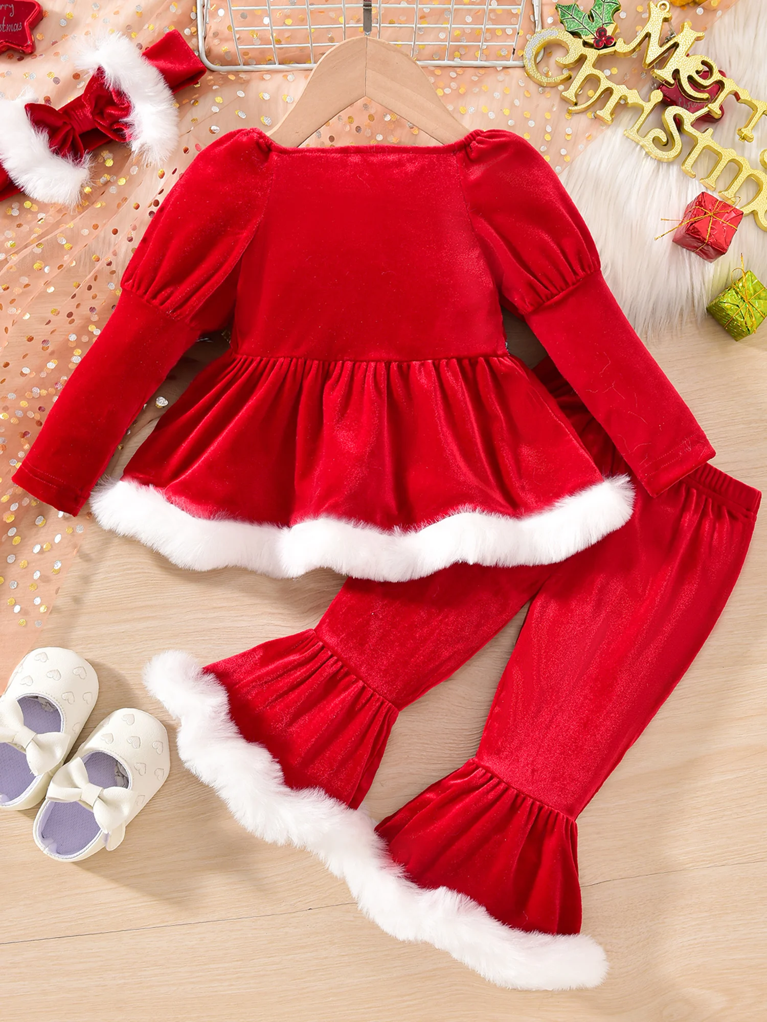 3Pcs Christmas Toddler Girl Outfit Long Sleeve Square Neck Plush Trim Tops with Elastic Waist Flare Pants Headband