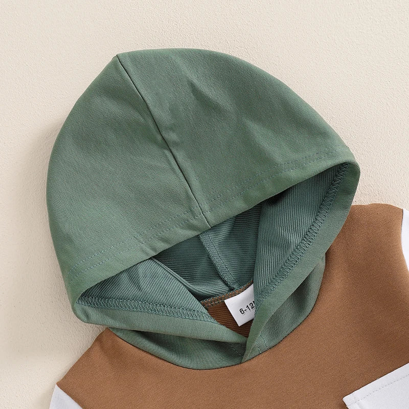 Toddler boys fall outfit in contrasting colors, warm and comfortable, boys sweatshirt with 1 chest pocket and hooded and long sleeve design. Baby boy sweatpants with elastic waist design ensures a comfortable fit, perfect for fall.