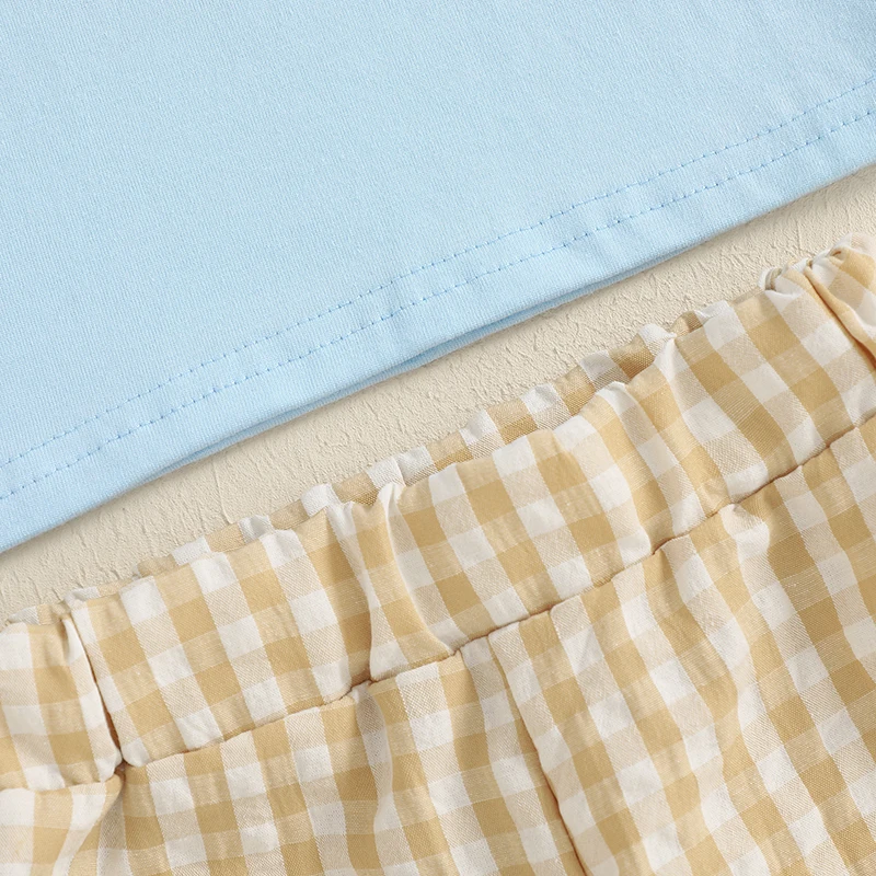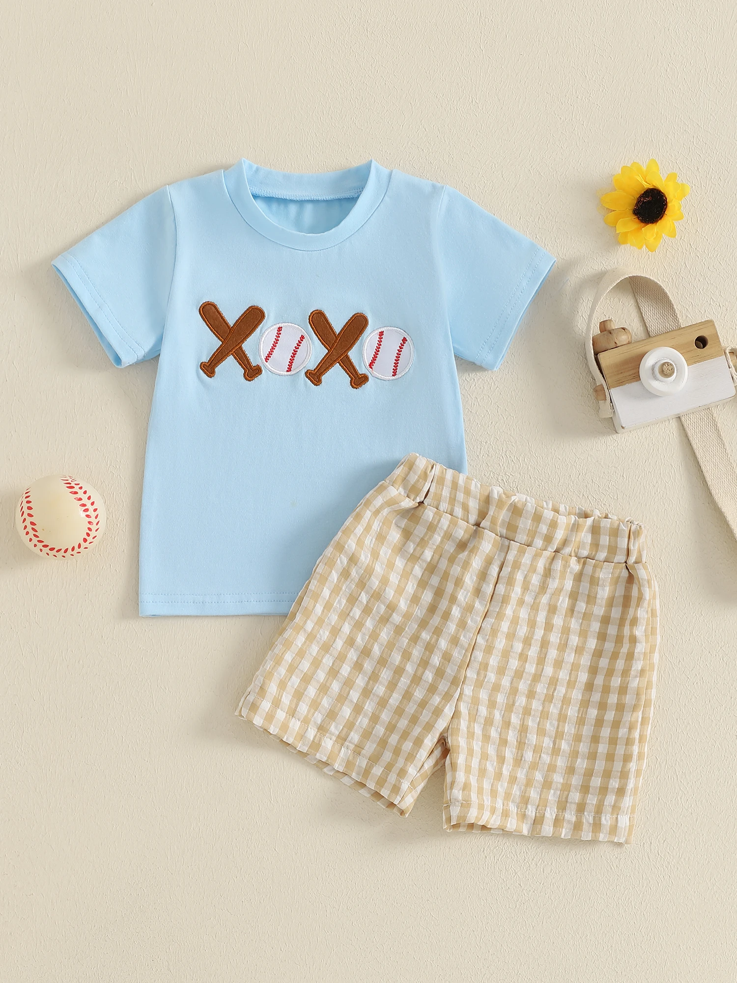 Boys 2-Piece Outfit Set with Embroidered Baseball Tee and Plaid Shorts Elastic Waistband Short Sleeve Top