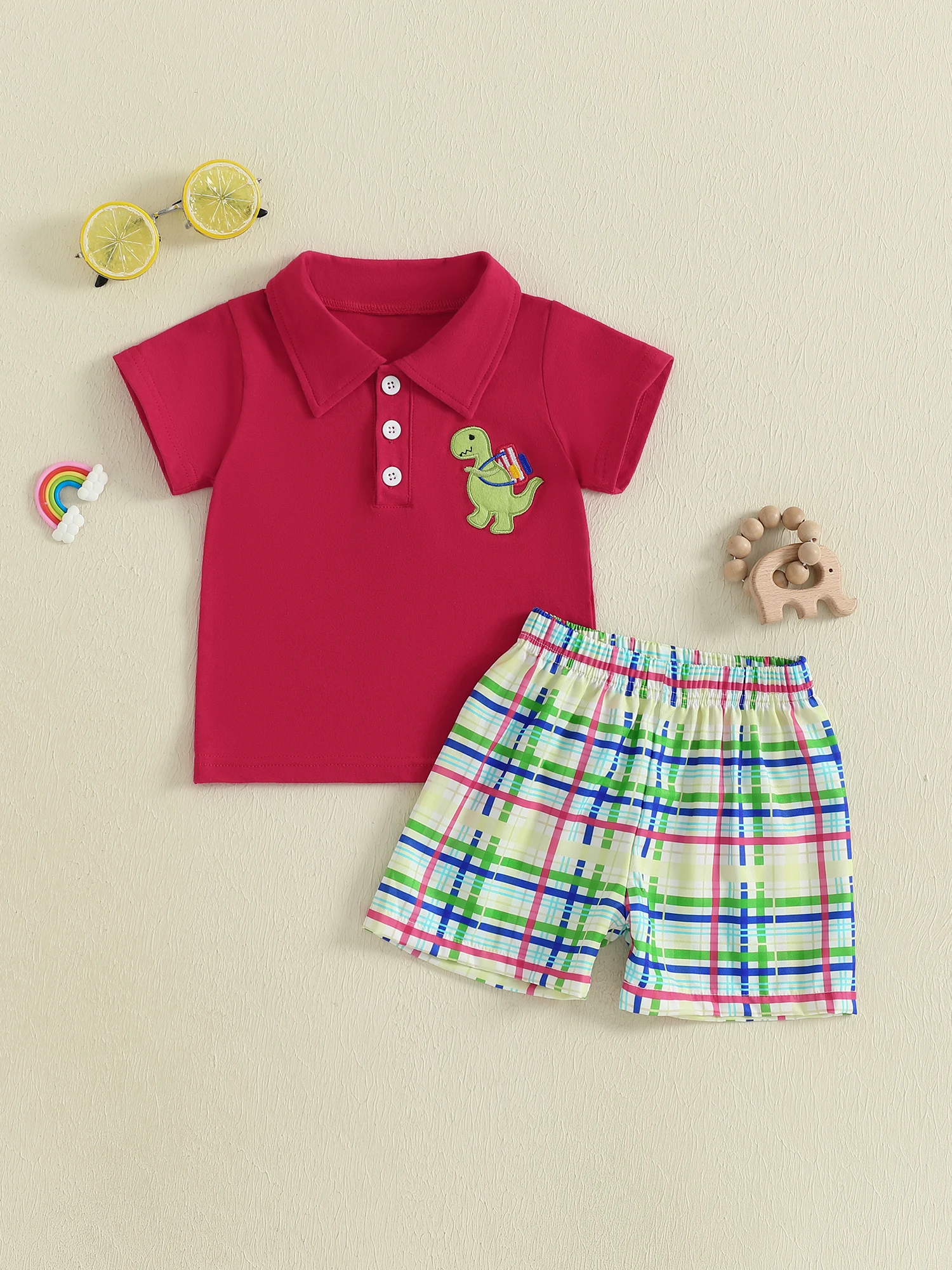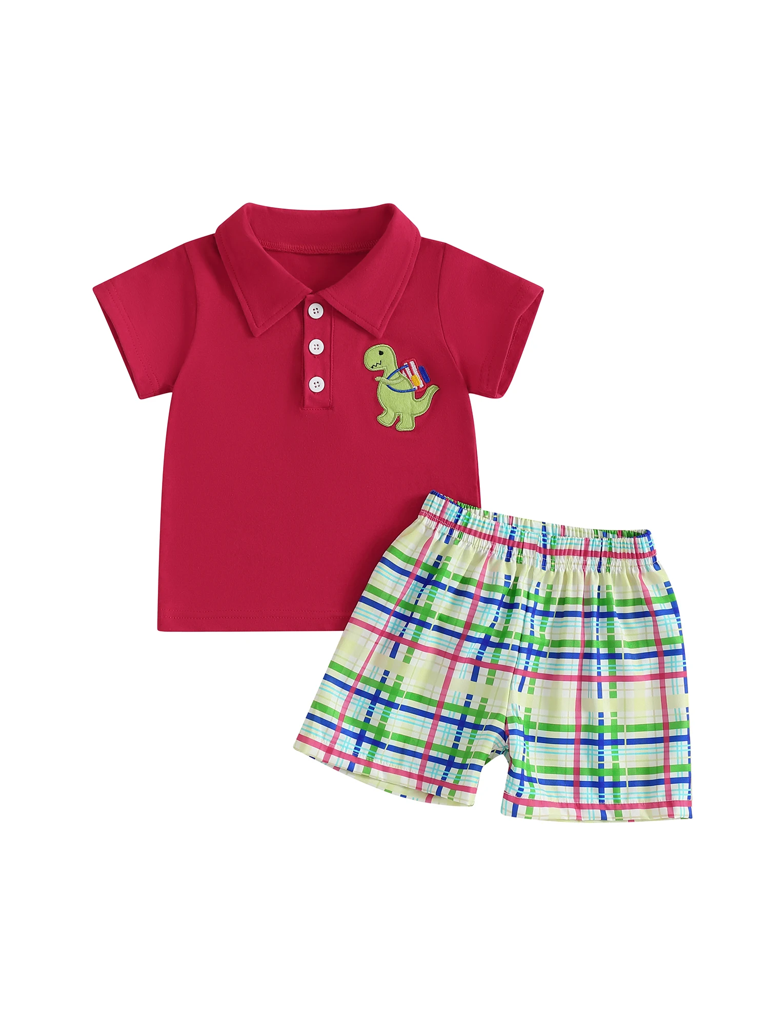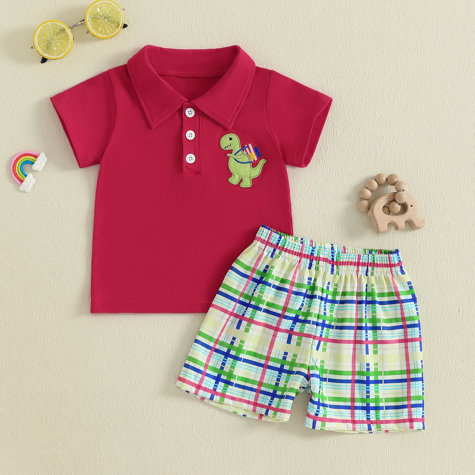 Boys Summer Outfit Set with Short Sleeve Lapel Dinosaur Embroidery Top and Plaid Shorts for a Stylish Look