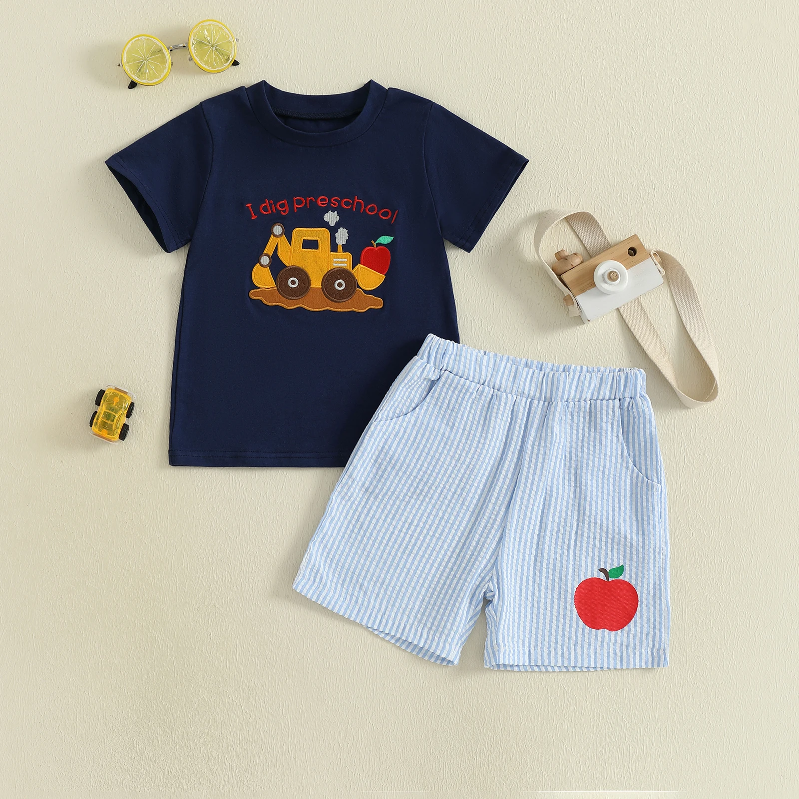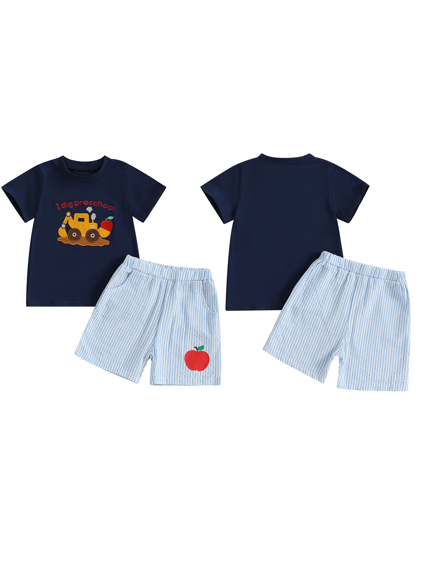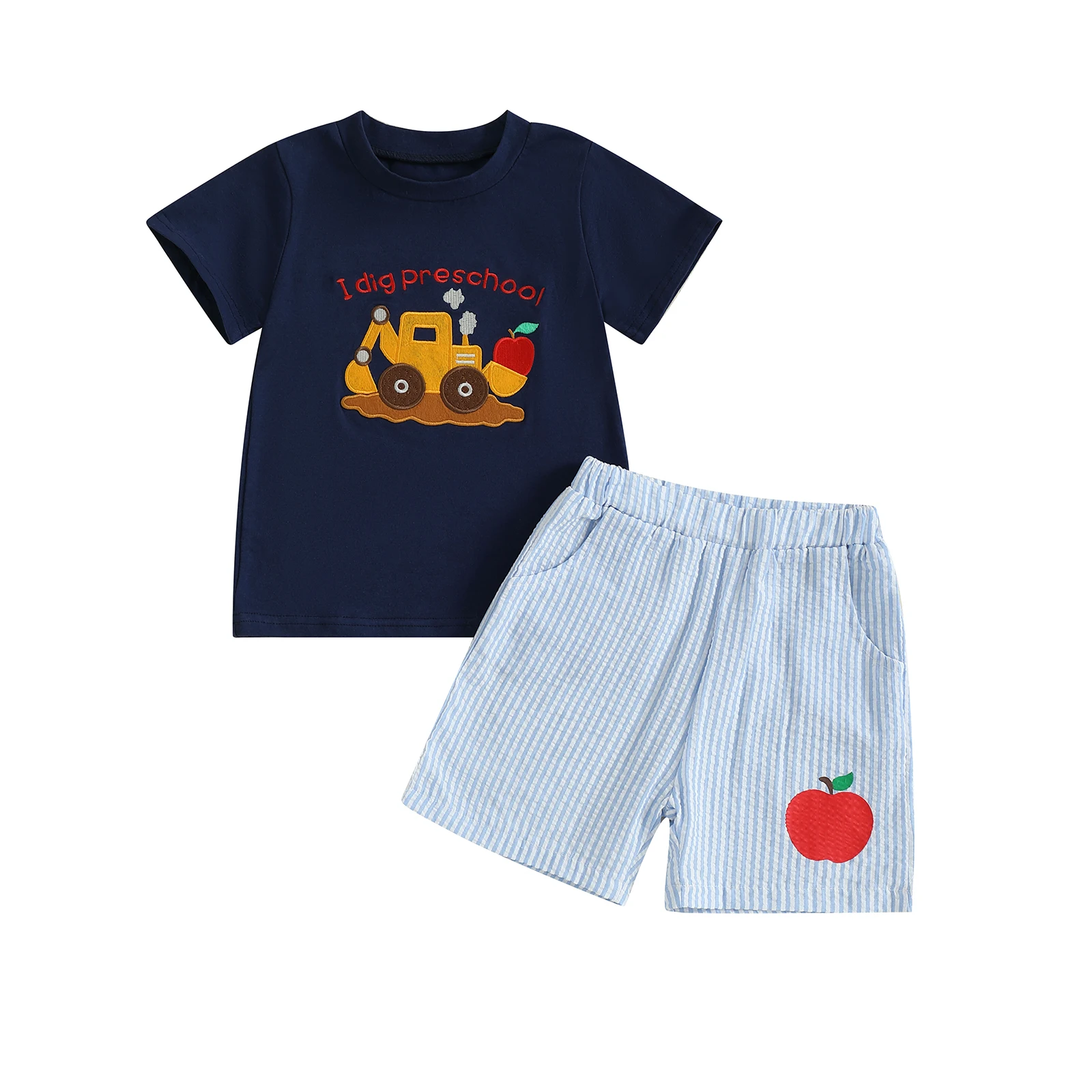 Boys Summer Shorts Sets Short Sleeve O Neck Excavator Embroidery Tops and Plaid Shorts