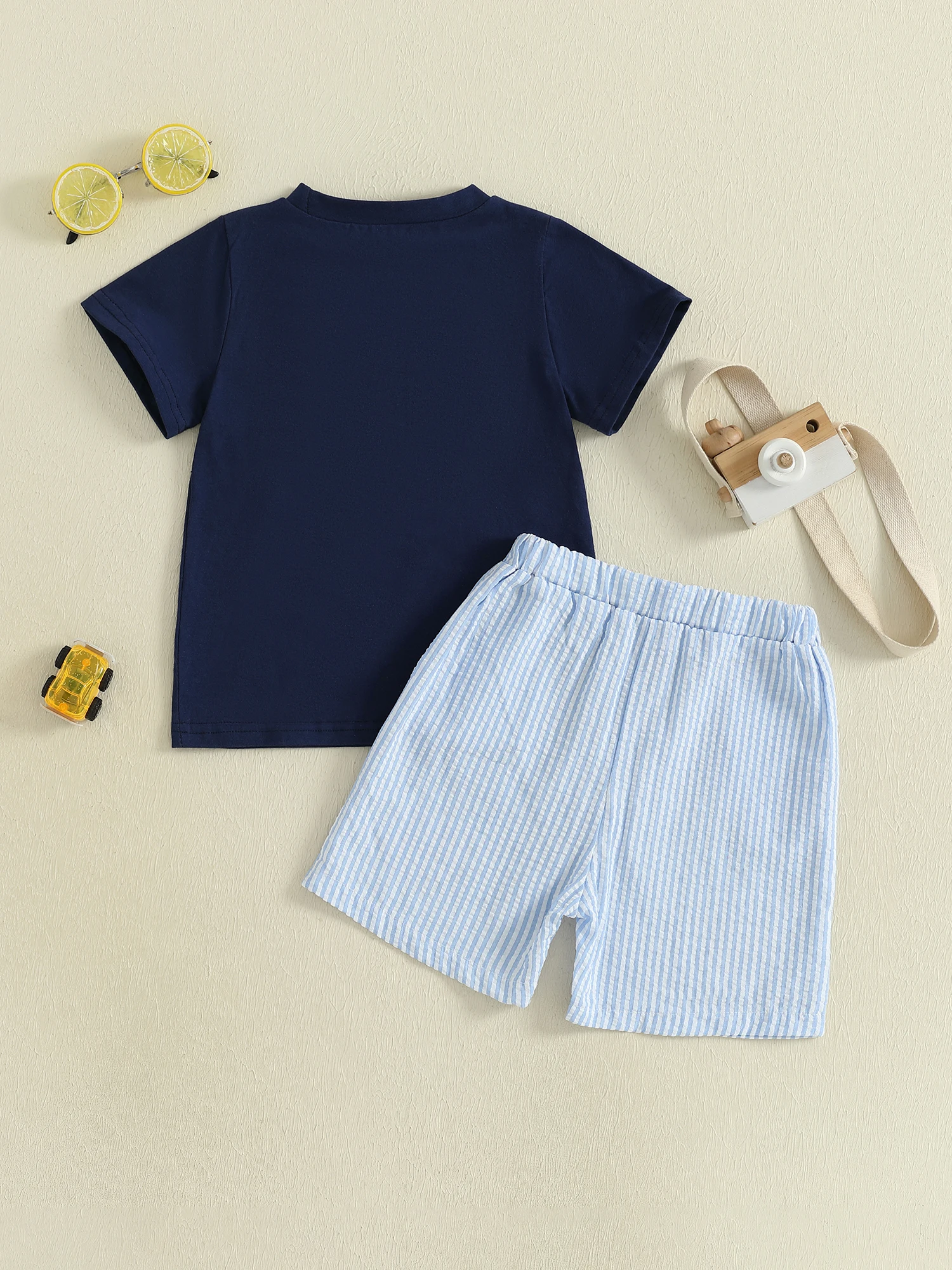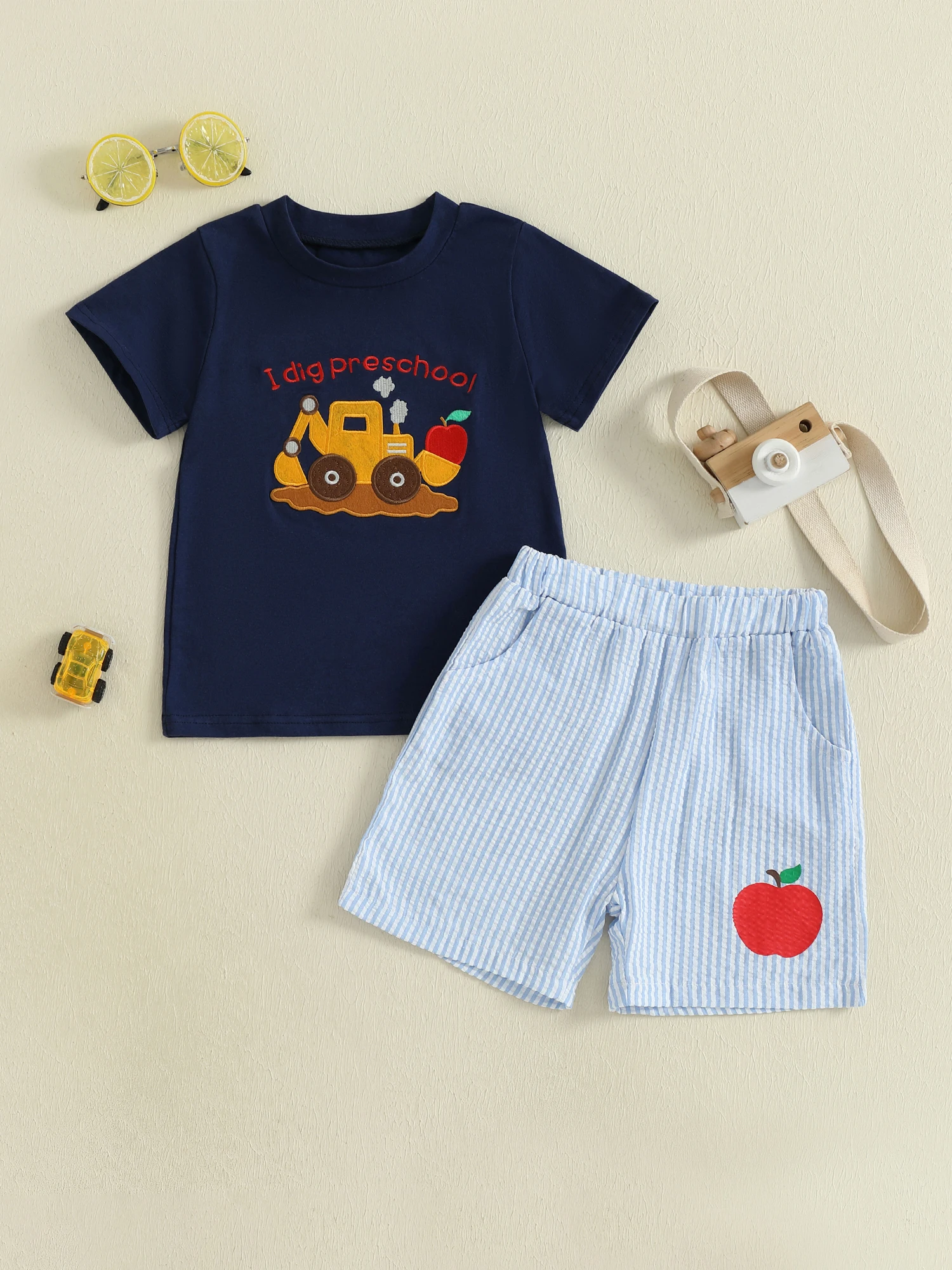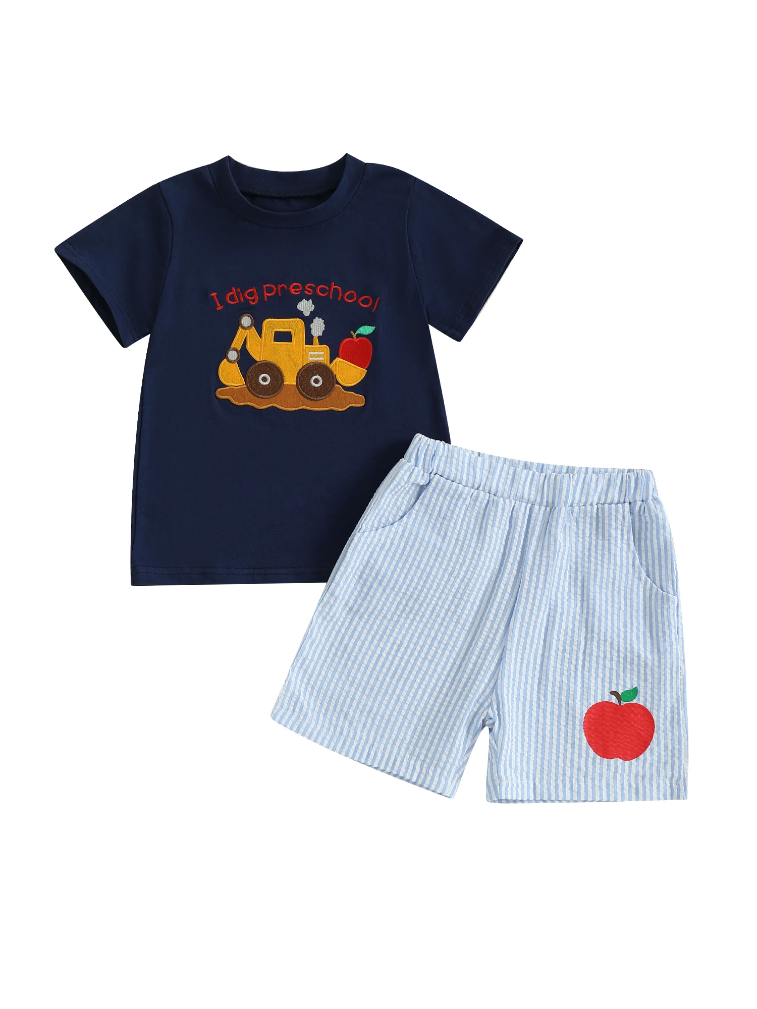 Boys Summer Shorts Sets Short Sleeve O Neck Excavator Embroidery Tops and Plaid Shorts