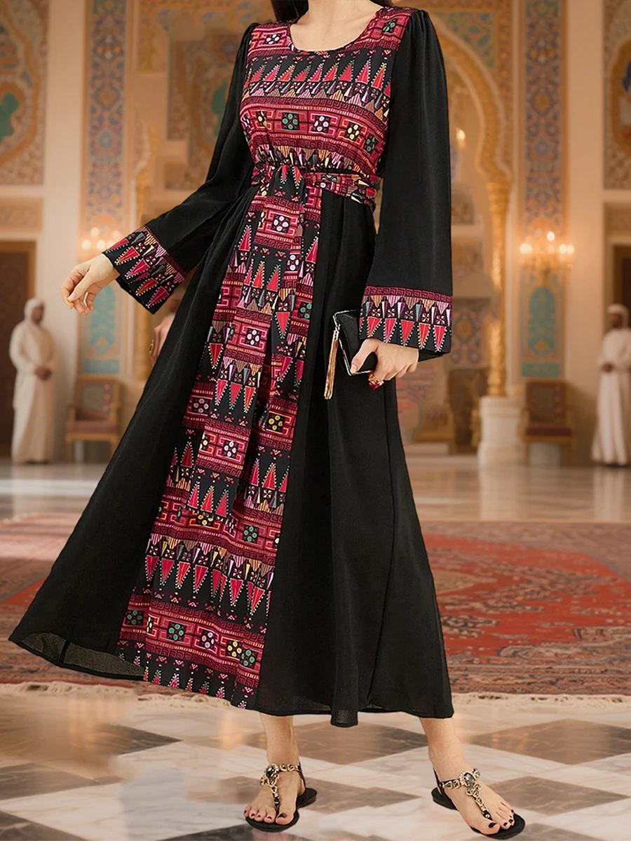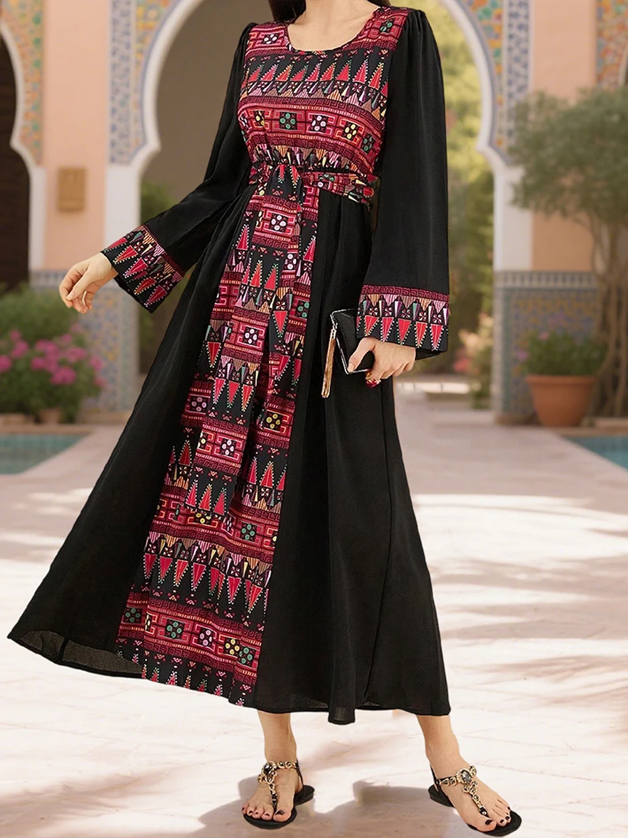 Women's Autumn Long Kaftan Dress Long Sleeve Retro Pattern Print Smocked Waist Arab Dress