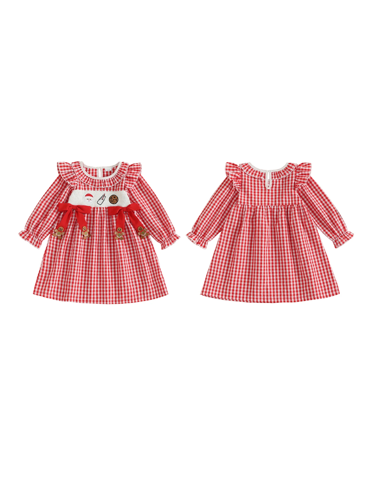 Girls Christmas Dress Long Sleeve Crew Neck Plaid Embroidery Santa Claus Winter Dress with Bow Detail