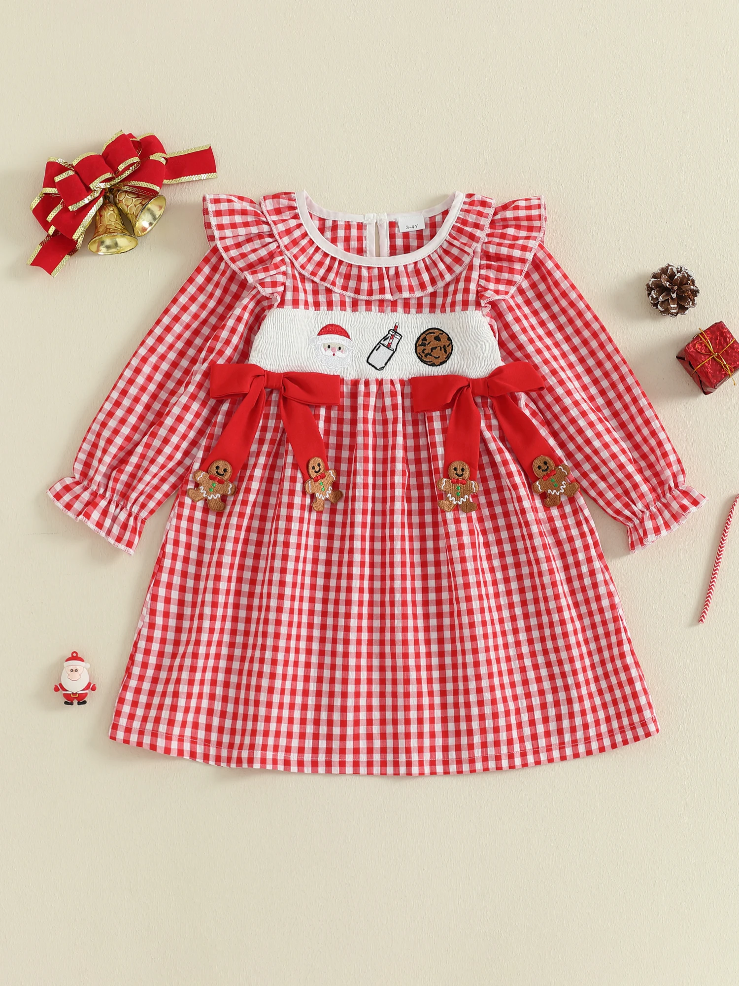 Kids Girls Christmas Dress, Long Sleeve Dress Crew Neck Plaid Embroidery Gingerbread Man Fall Dress