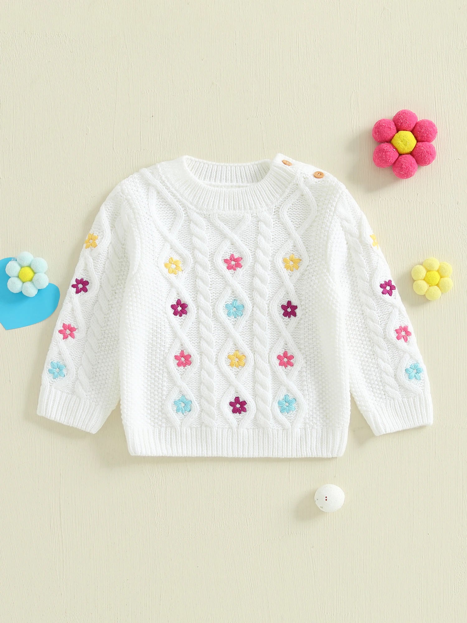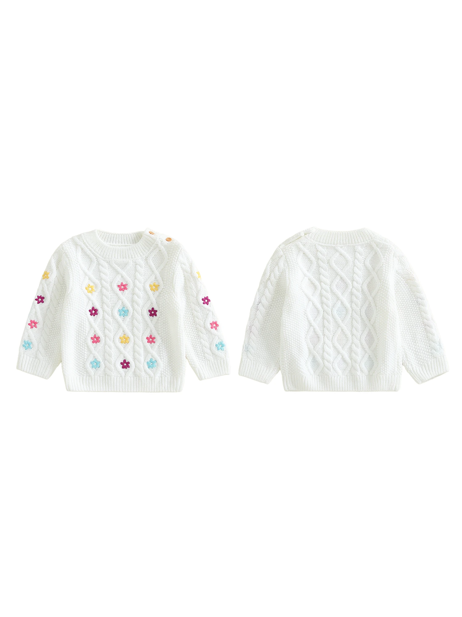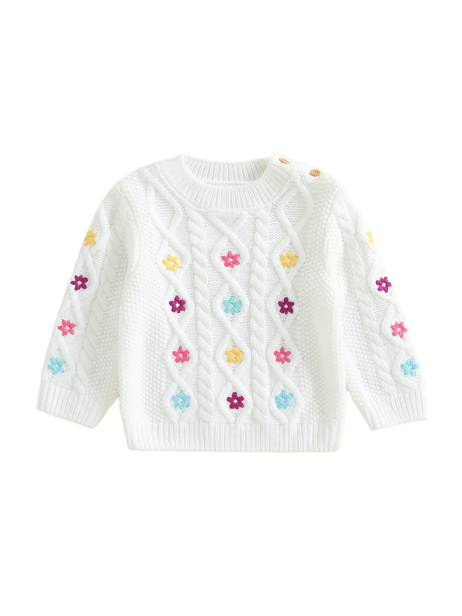Infant Girls Floral Embroidered Knit Sweater with Crew Neck Jacquard Design and Long Sleeves - Adorable Pullover Top