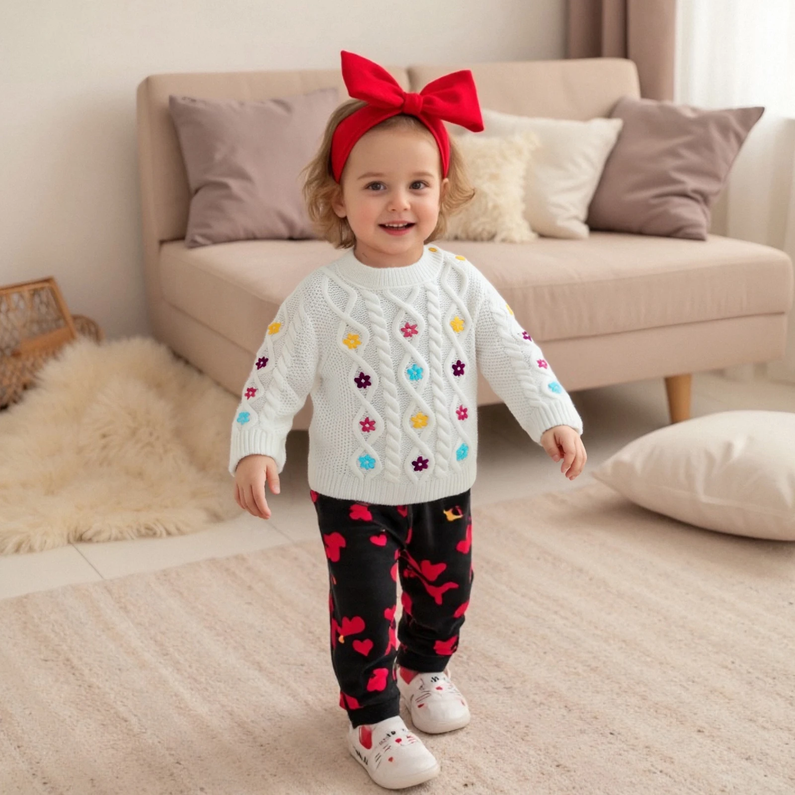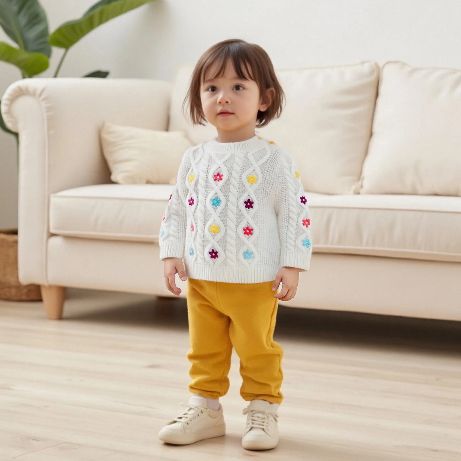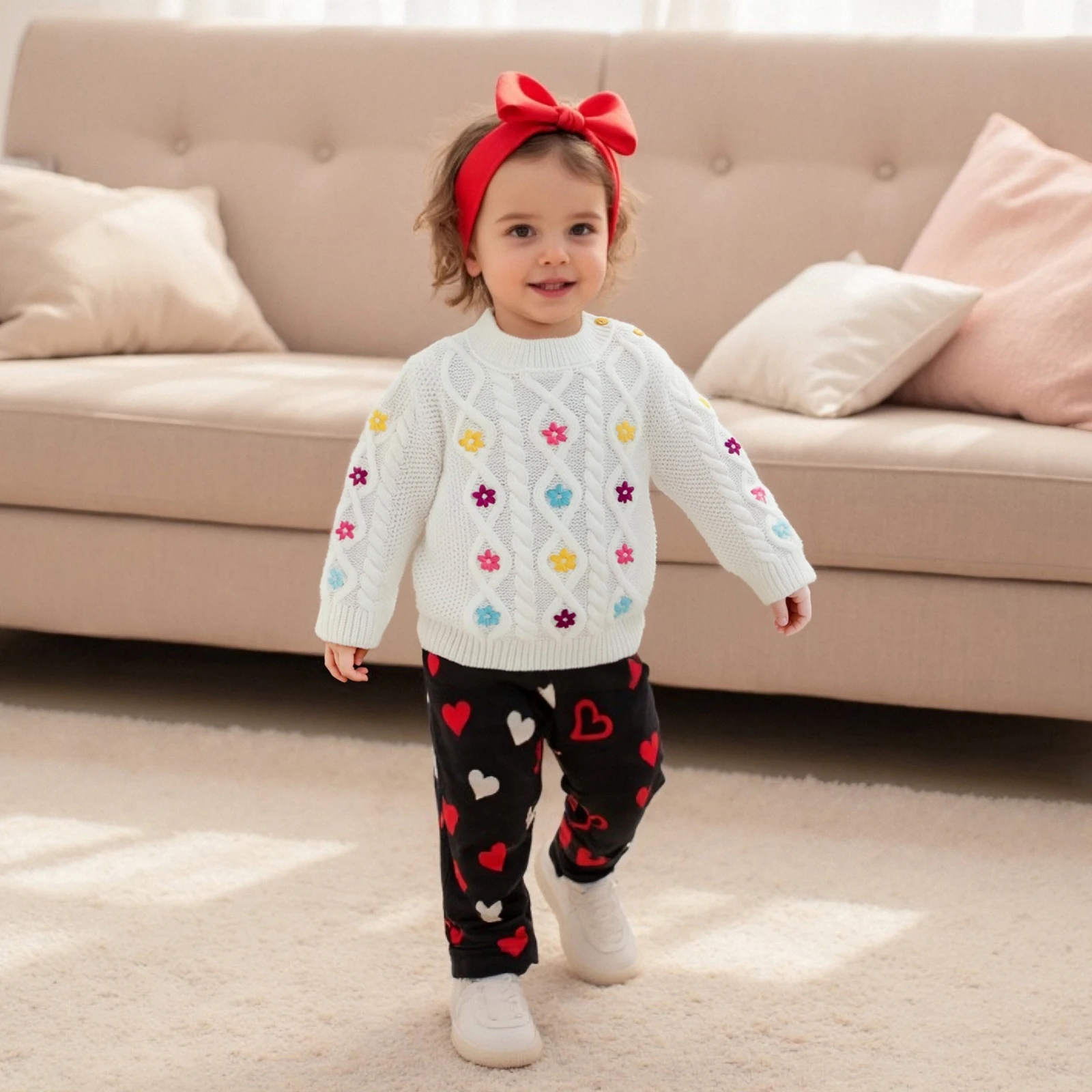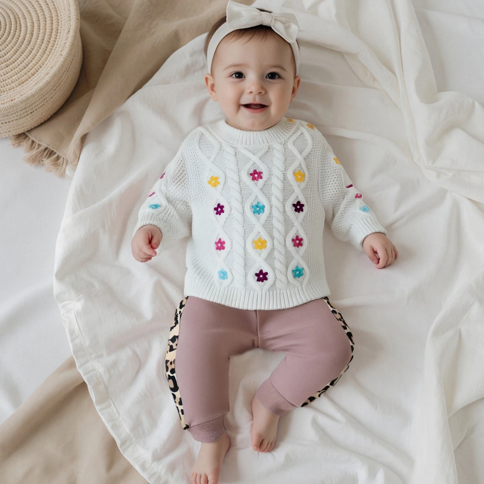 Infant Girls Floral Embroidered Knit Sweater with Crew Neck Jacquard Design and Long Sleeves - Adorable Pullover Top