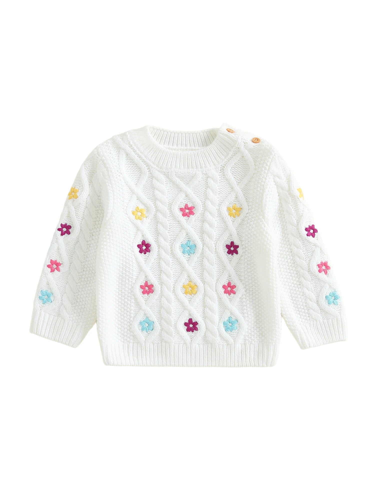 Toddler Baby Girls Knit Sweater Flower Embroidery Crew Neck Jacquard Pullover Long Sleeve Tops